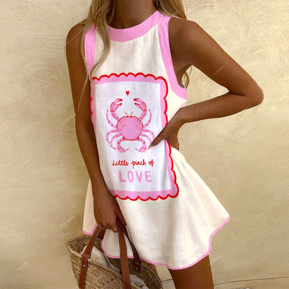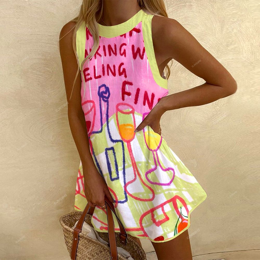 Women's Fashion Color Block Art Print Sleeveless Cotton Pocket Wrap Dress