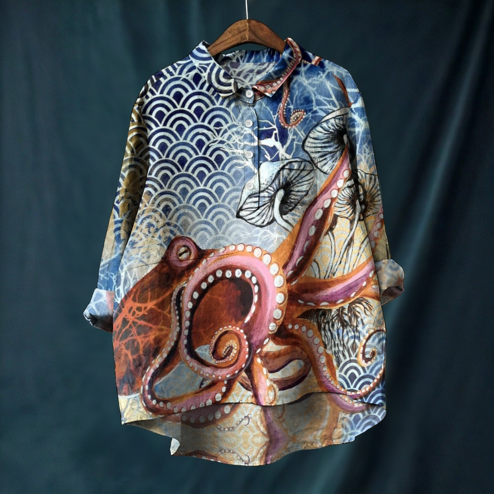 Women's Ocean Wave Octopus Printed Casual Long Sleeve Shirt