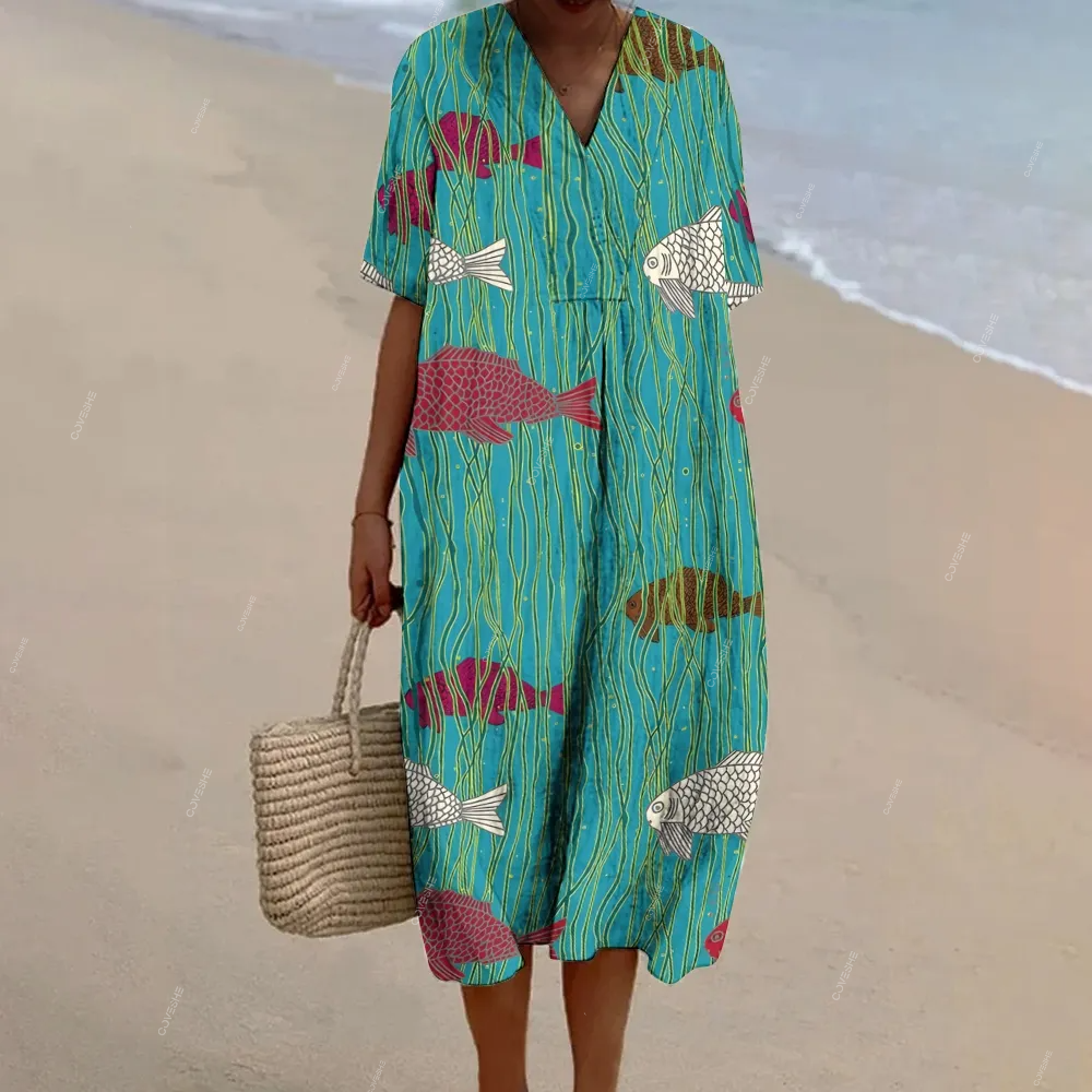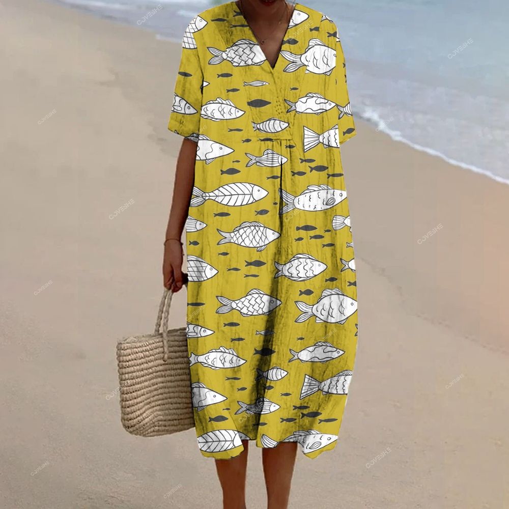 Women's Cartoon Geometric Fish Printed Flowy Dress