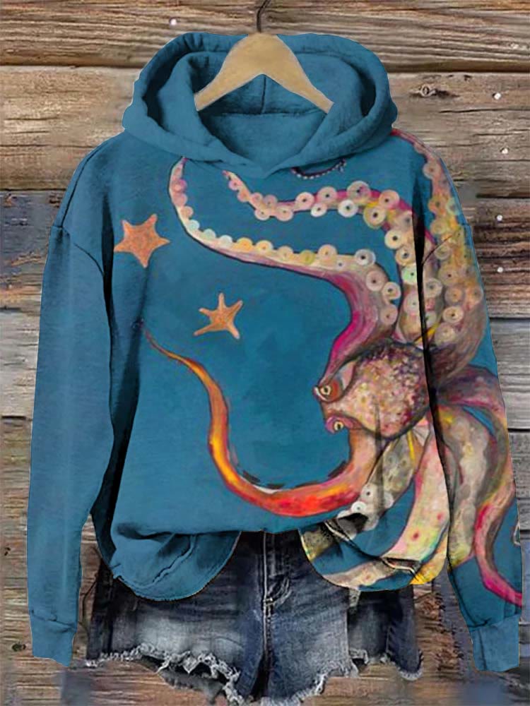 Octopus And Starfish Print Long-Sleeved Hoodie