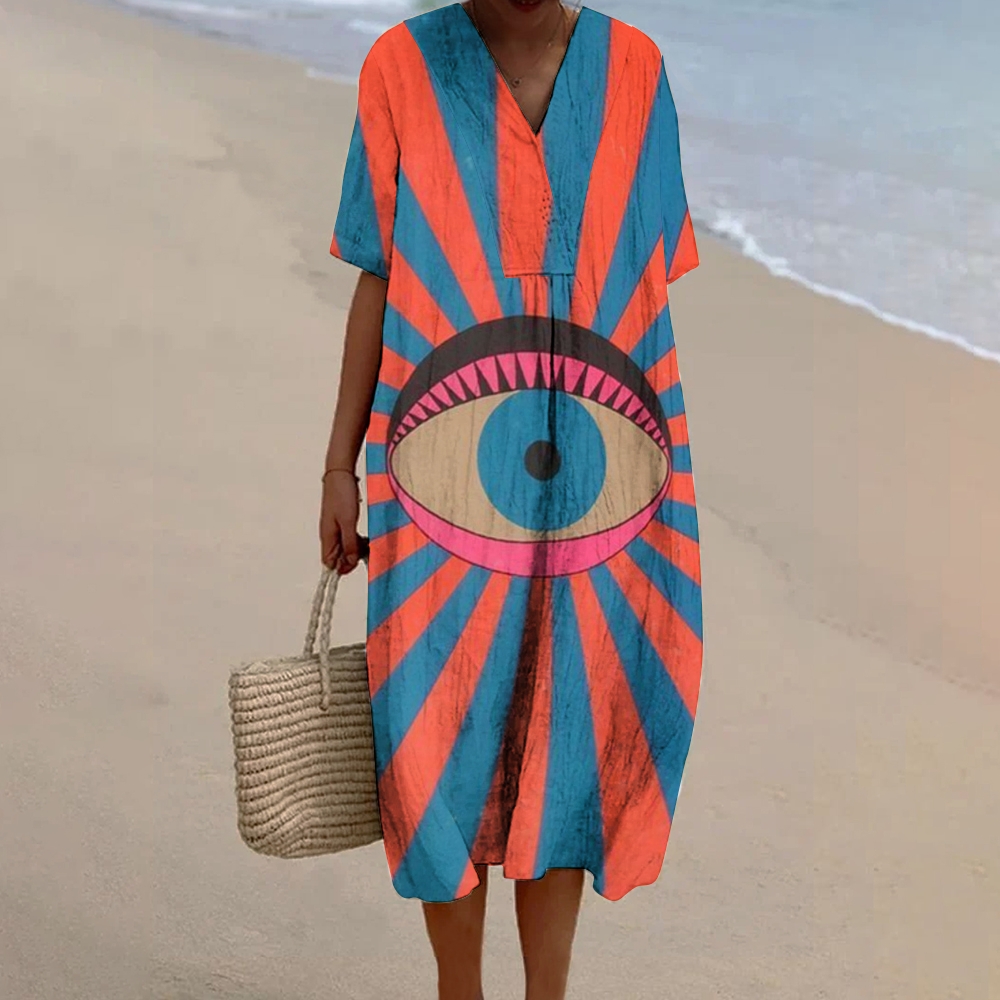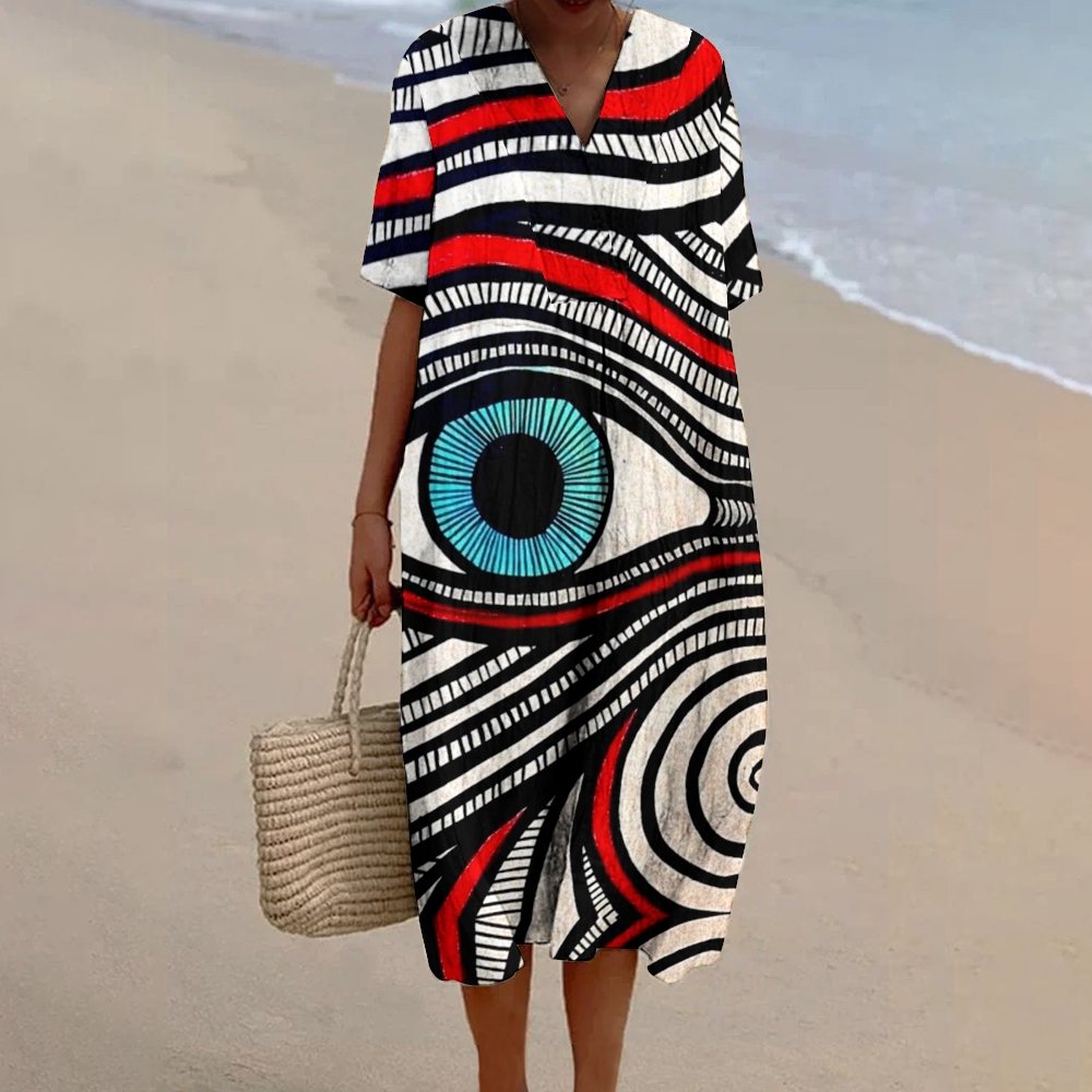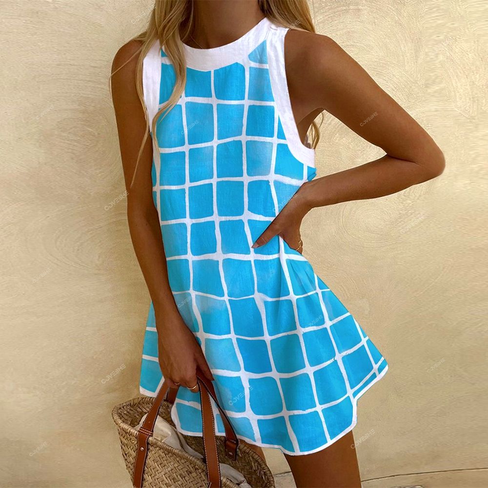Women's Vintage Abstract Geometric Art Print Sleeveless Cotton Pocket Wrap Dress