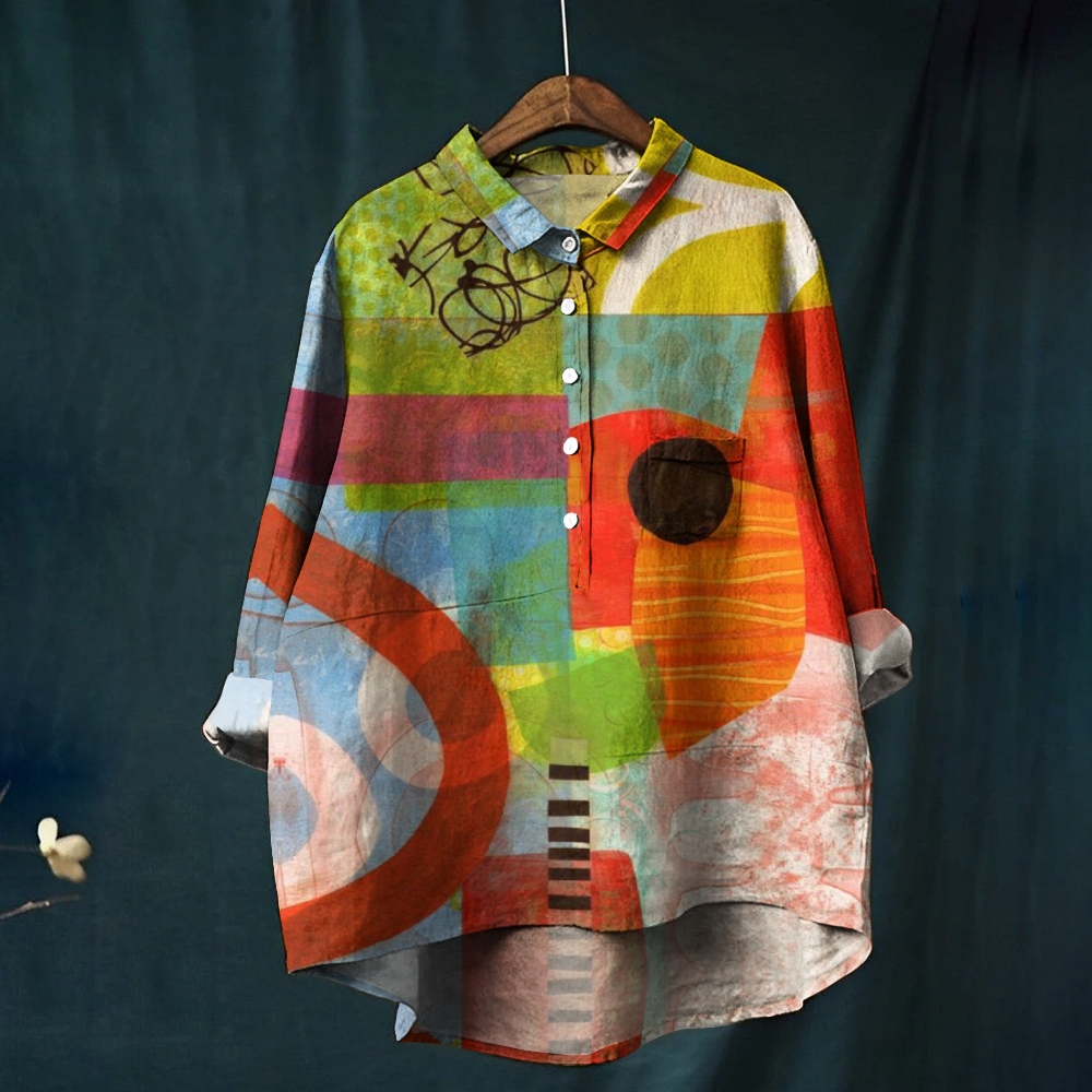 Vintage Color Block Art Print Casual 100% Cotton Shirt