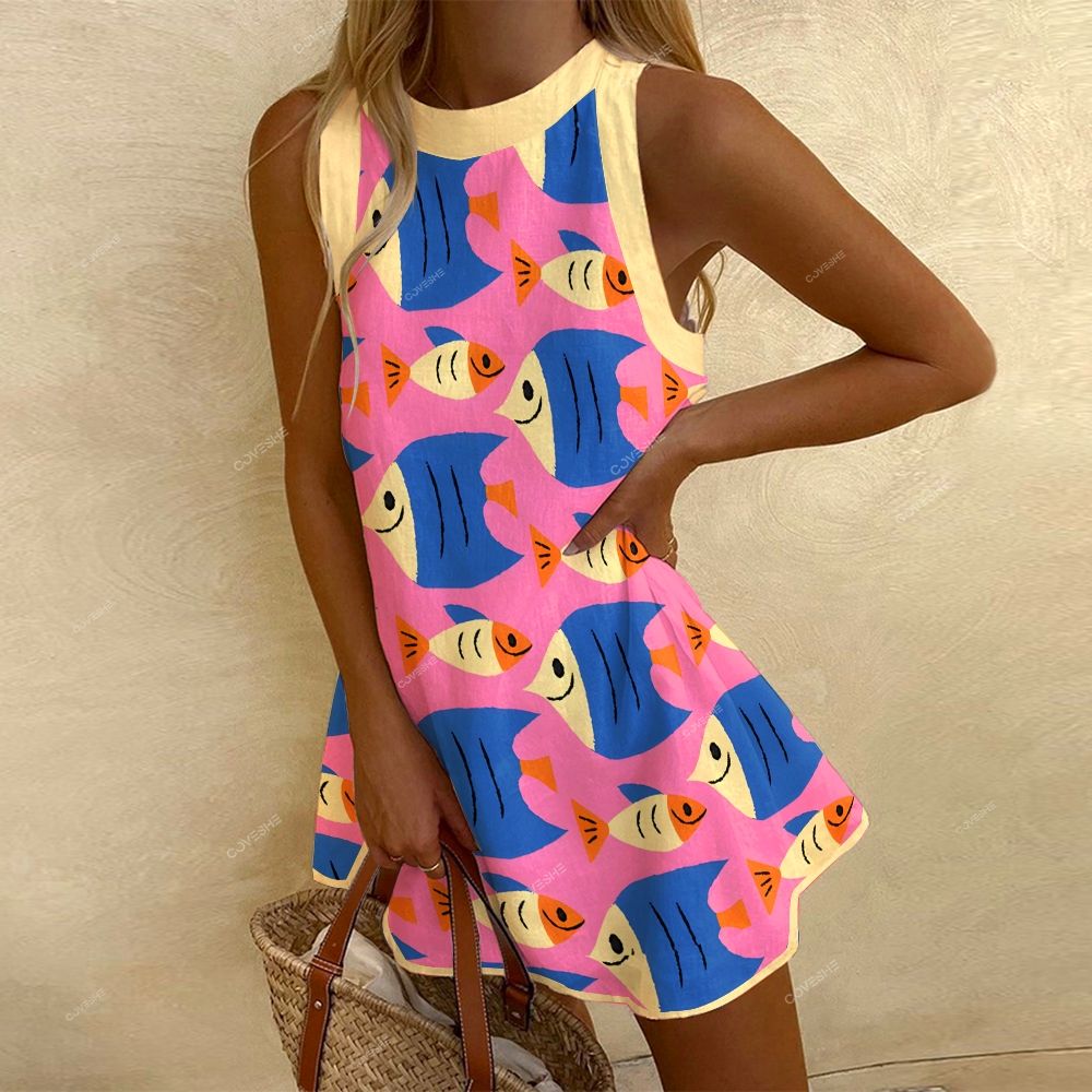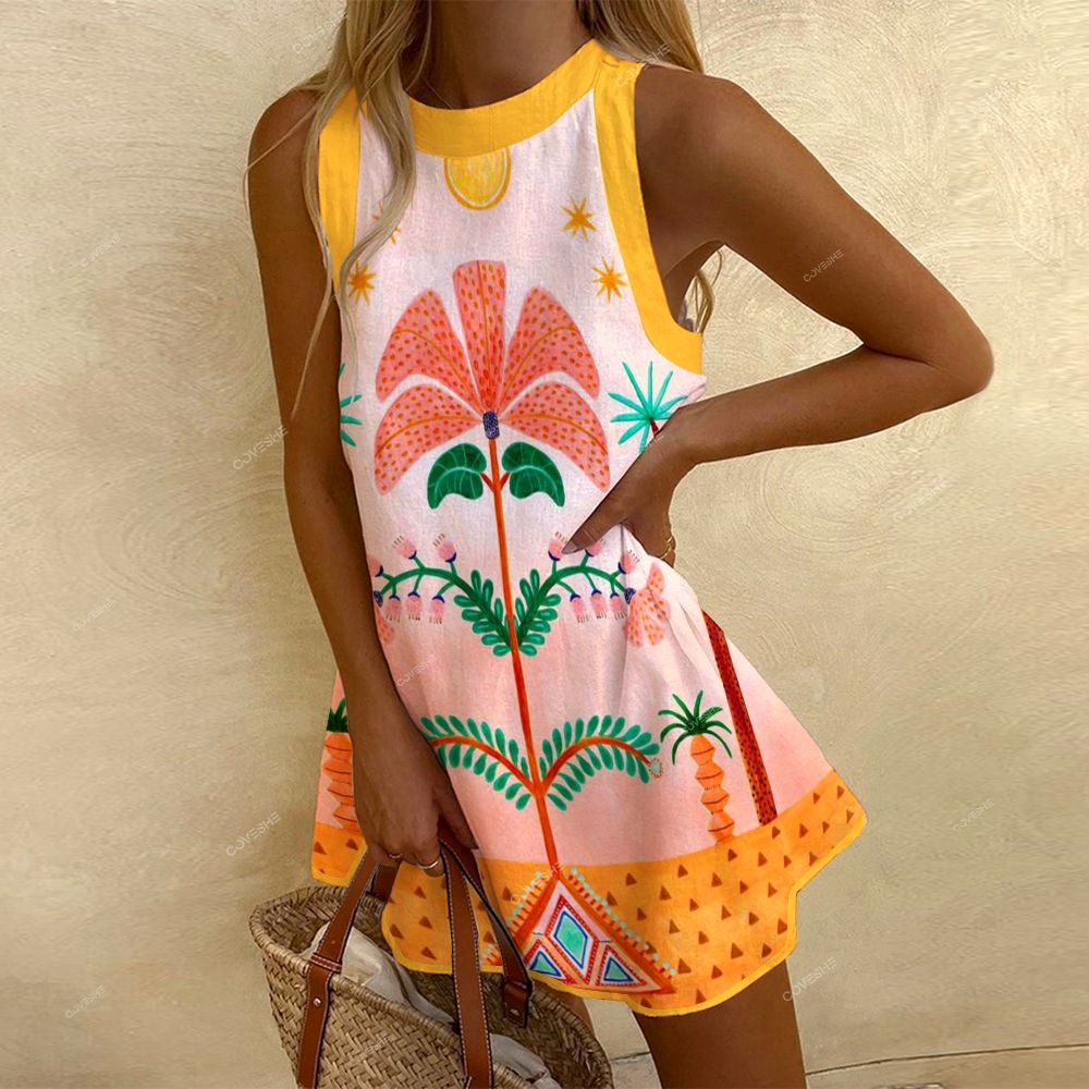 Women's Sleeveless Beach Fruit Coconut Tree Printed Dress