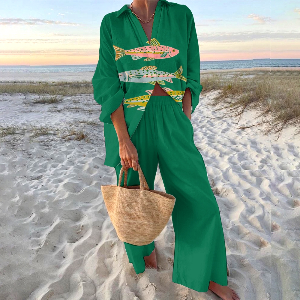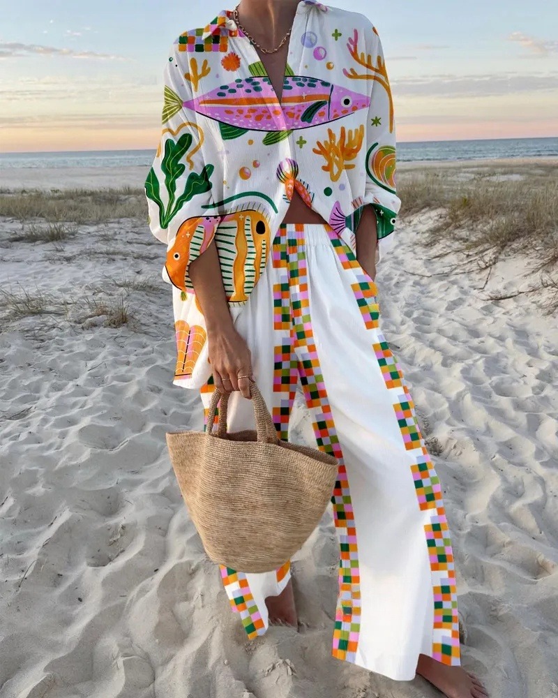 Women's Sardines Printed Shirt & Pants Two-piece Set