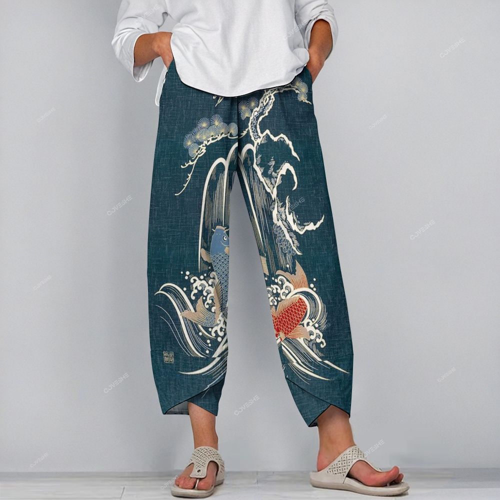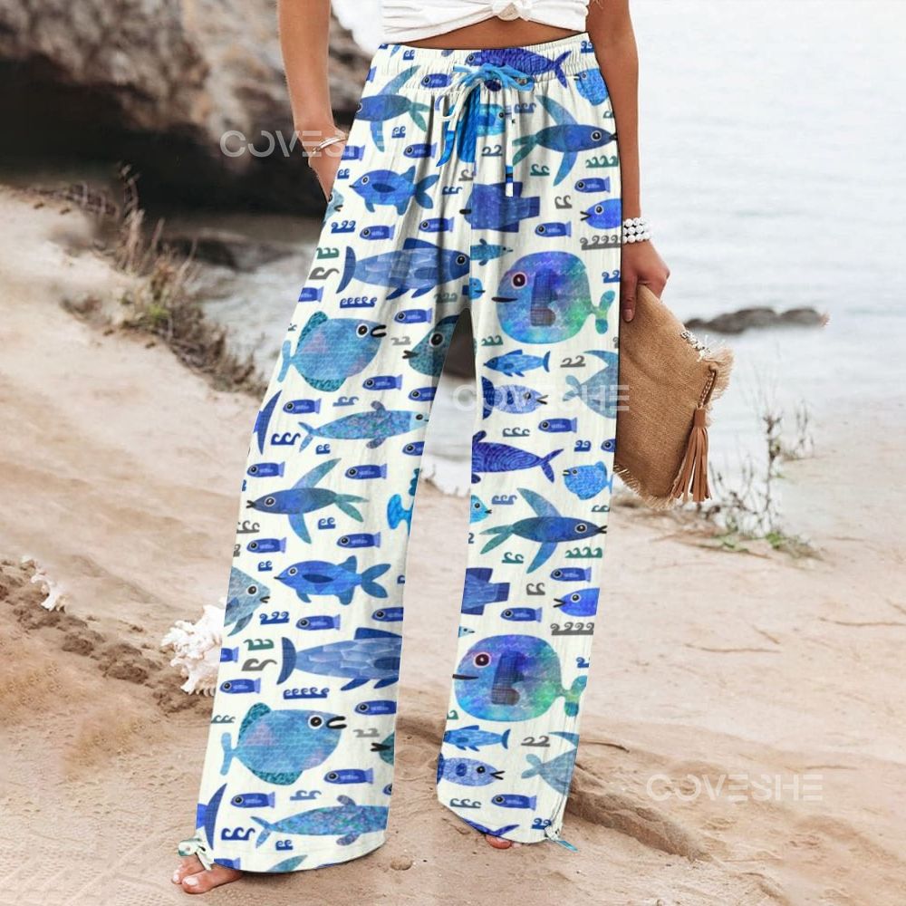 Women's Wide Leg Casual Blue Fish Printed Pants