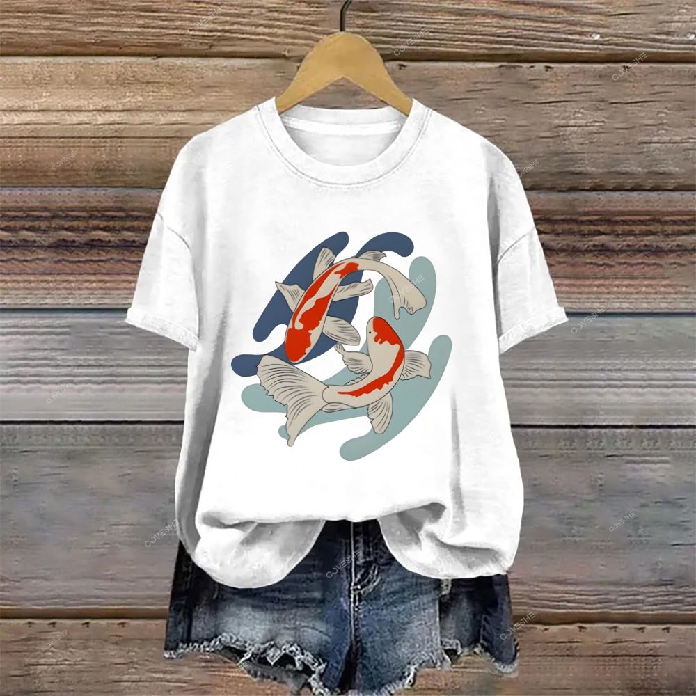 Crew Neck Wave Koi Printed Casual Cotton T-shirt