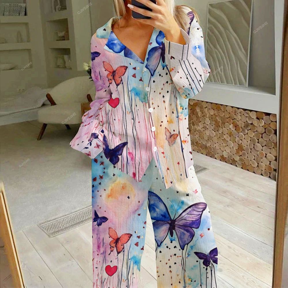Women's Art Butterfly Printed Cotton Cardigan Homewear Set