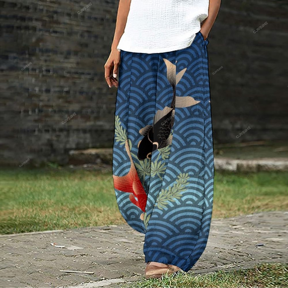 Women's Casual Wave Koi Printed Wide Leg Pants