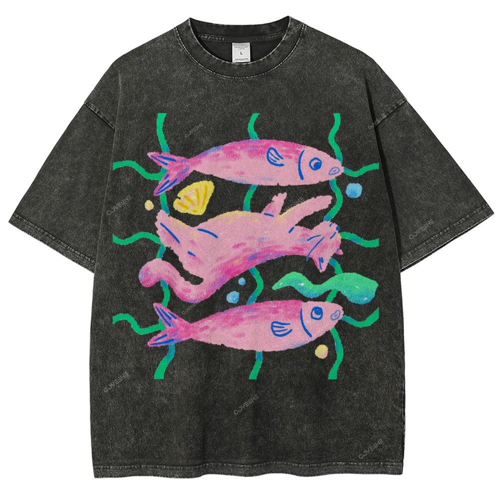 Women's Cartoon Octopus Printed Round Neck T-Shirt