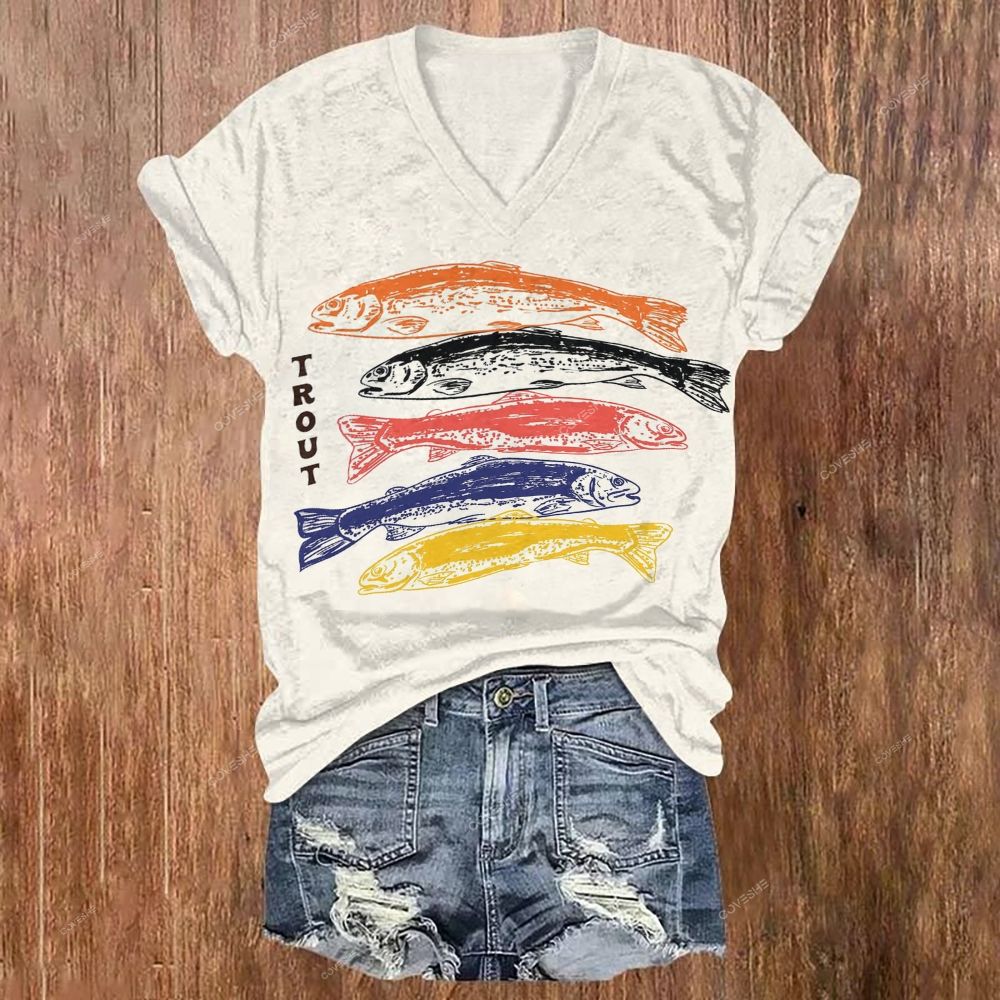 Women's V-neck Colorful Trout Printed Short Sleeve T-shirt