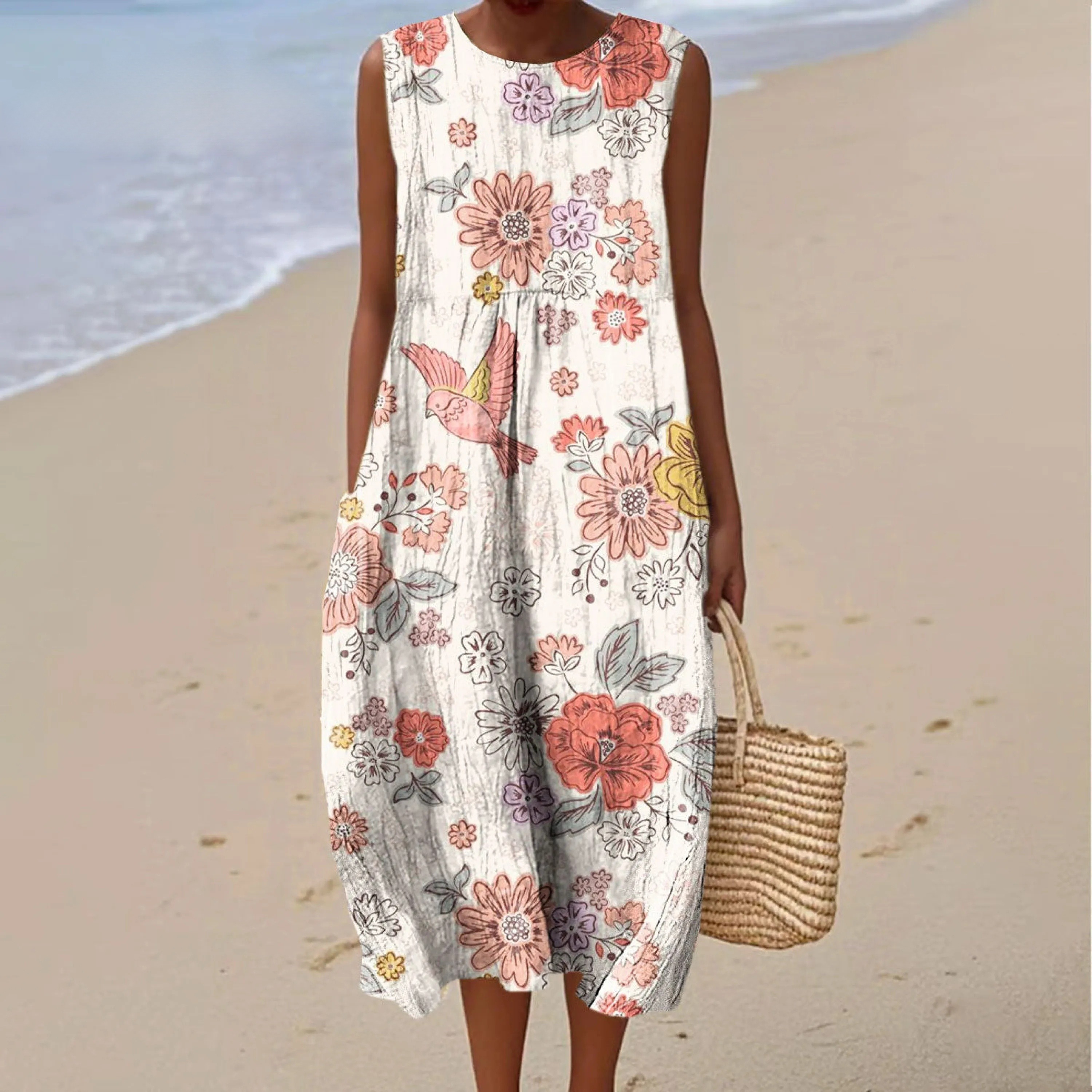 Women's Vintage Floral Art Print Sleeveless Cotton Pocket Wrap Dress