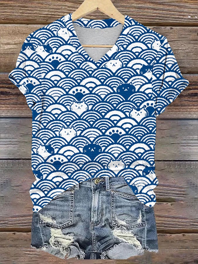 Women's Blue Waves&Cats Print V-Neck T-Shirt