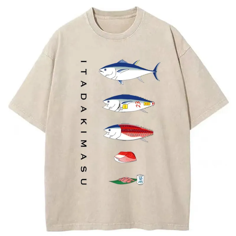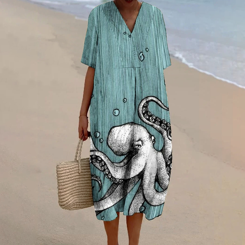Women's V-neck Vintage Wave Fish Printed Short Sleeve T-shirt