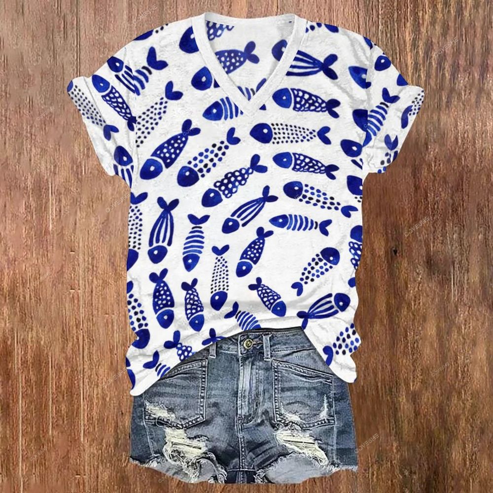 Women's V-neck Cartoon Geometric Fish Printed Short Sleeve T-shirt