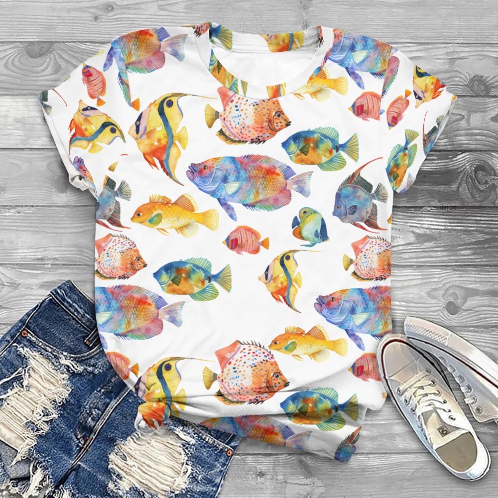 Women's Colorful Tropical Fish Printed Round Neck T-Shirt