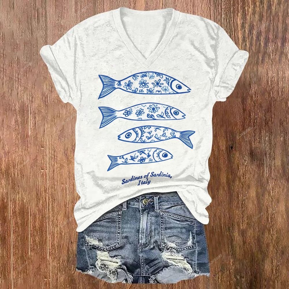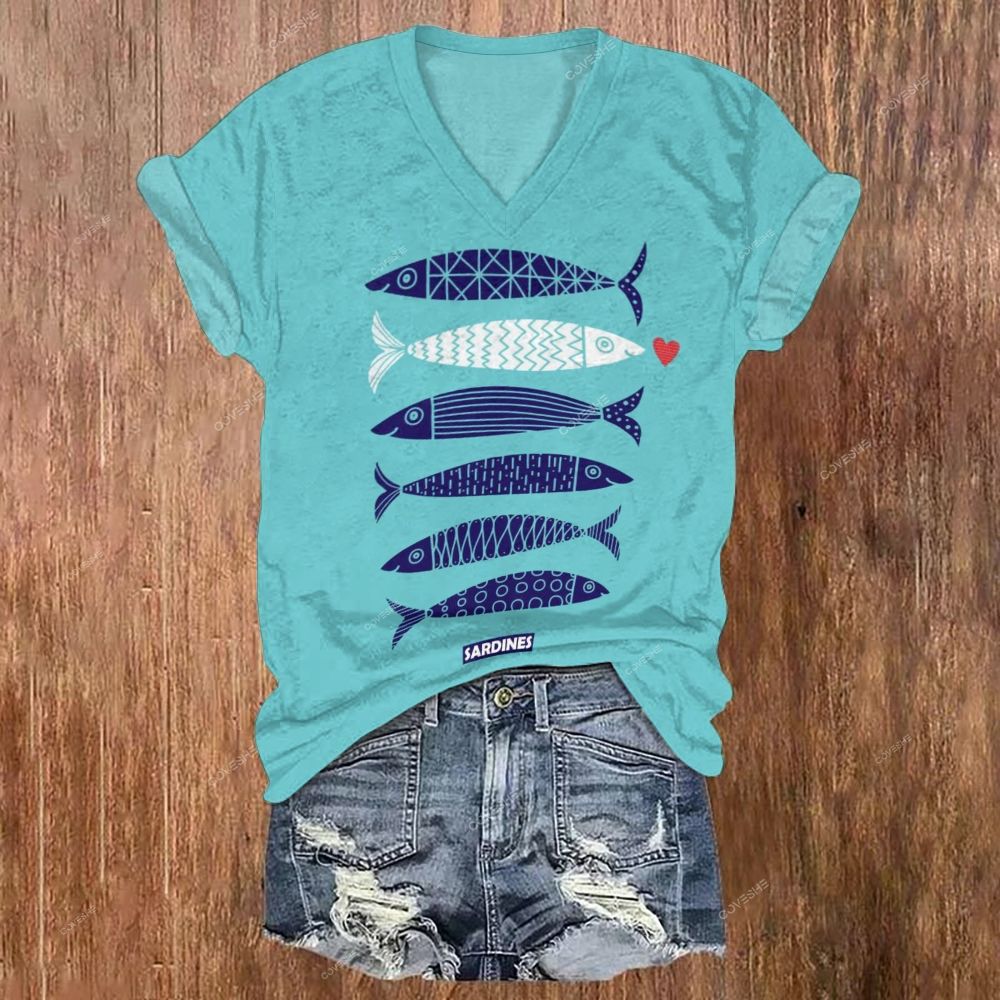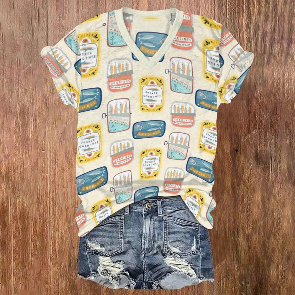 Women's V-neck Canned Sardines Printed Short Sleeve T-shirt