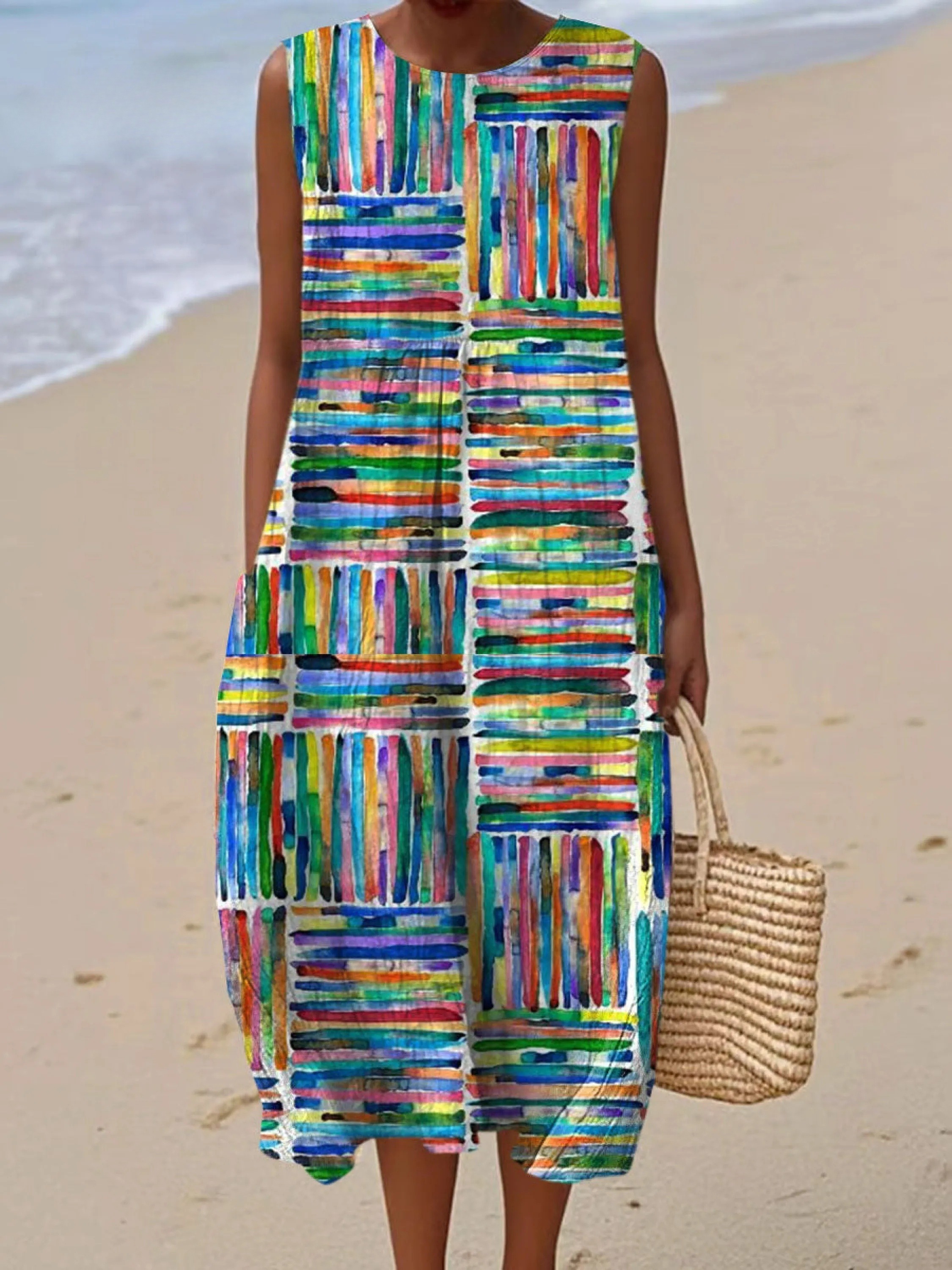 Women's Vintage Abstract Geometric Art Print Sleeveless Cotton Pocket Wrap Dress