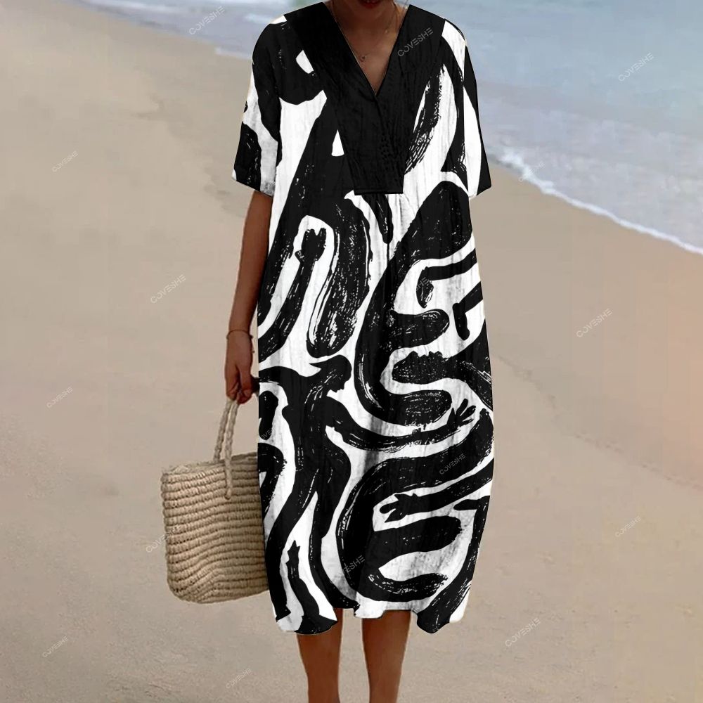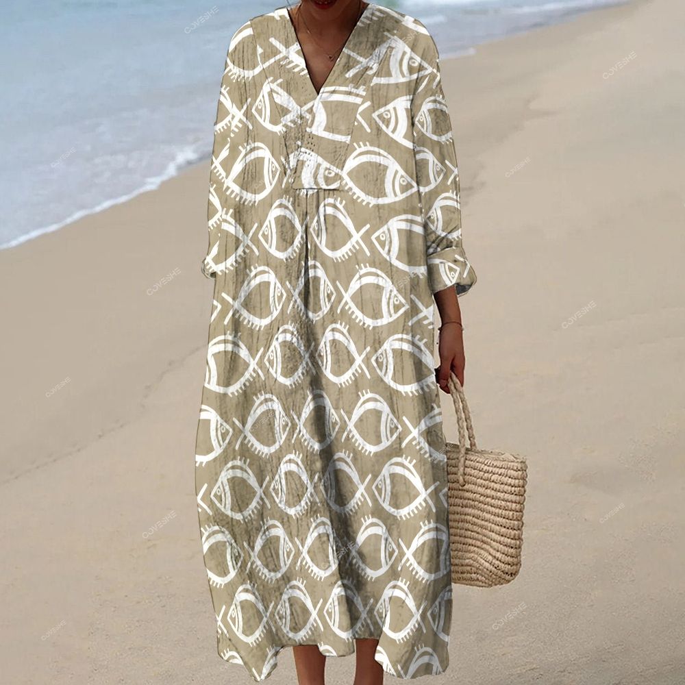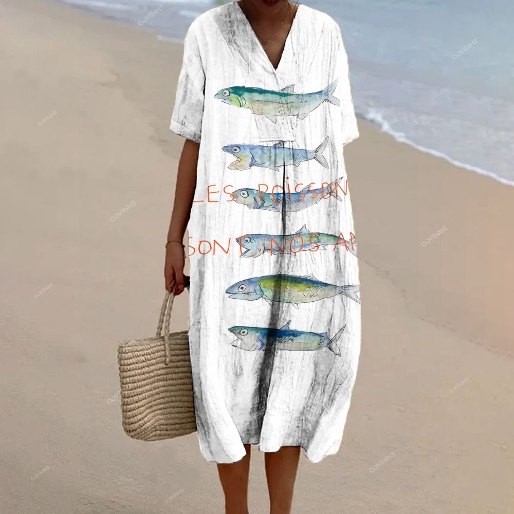 Women's Elegant Wave Undersea Fish Pattern V-Neck Cotton and Linen Dress