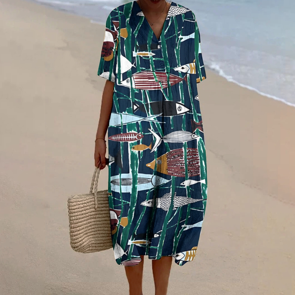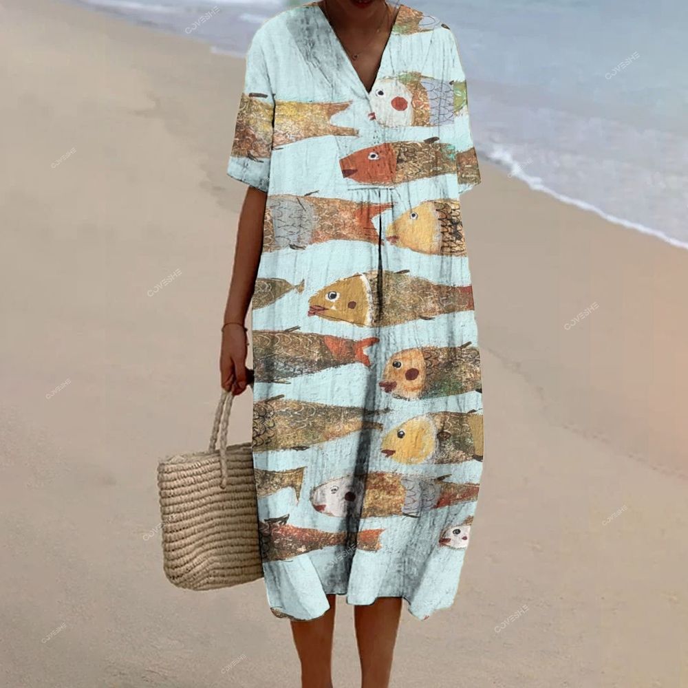 Women's Vintage Fish Printed Flowy Dress