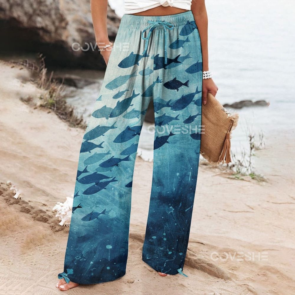 Women's Wide Leg Casual Blue Gradient Fish Printed Pants