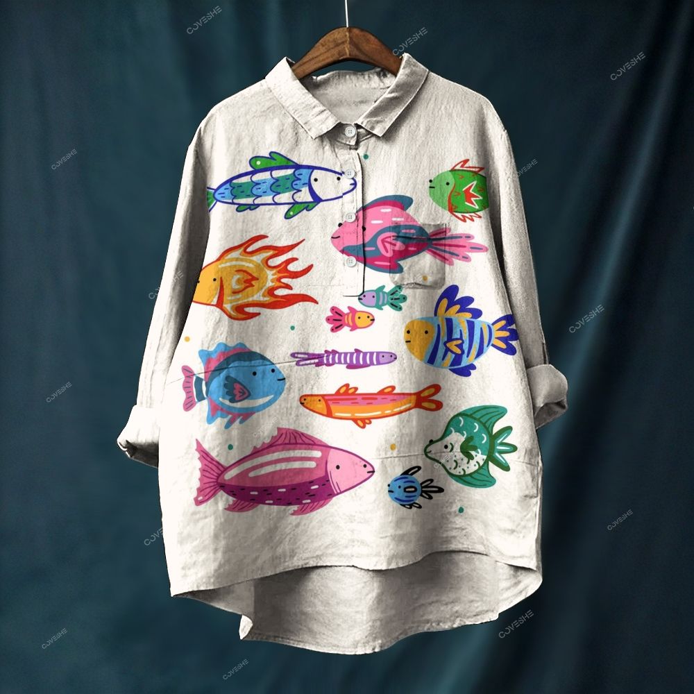 Women's Cartoon Colorful Fish Printed Casual Long Sleeve Shirt