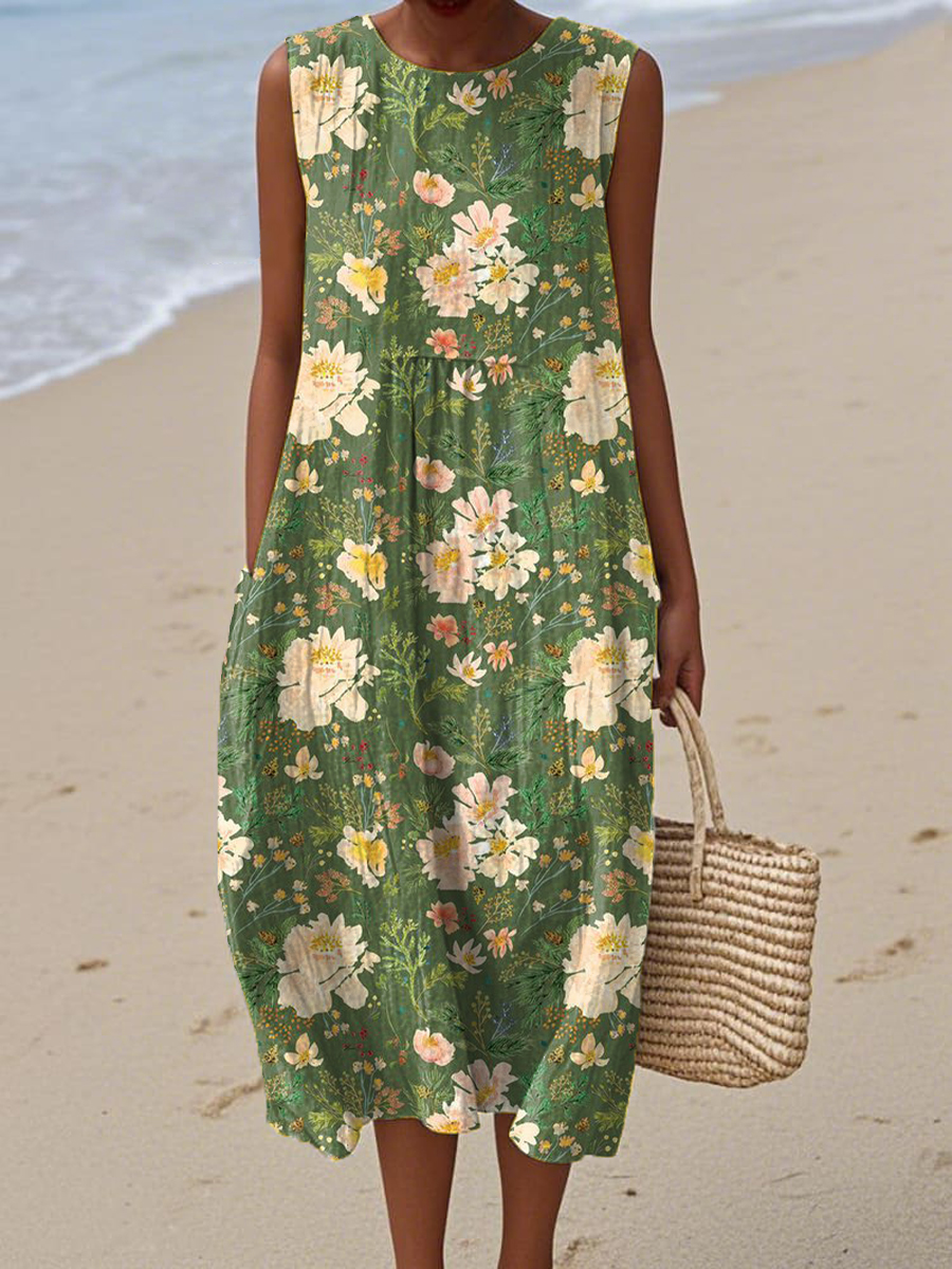 Women's Vintage Ethnic Floral Art Prints Sleeveless Cotton Pocket Wrap Dress