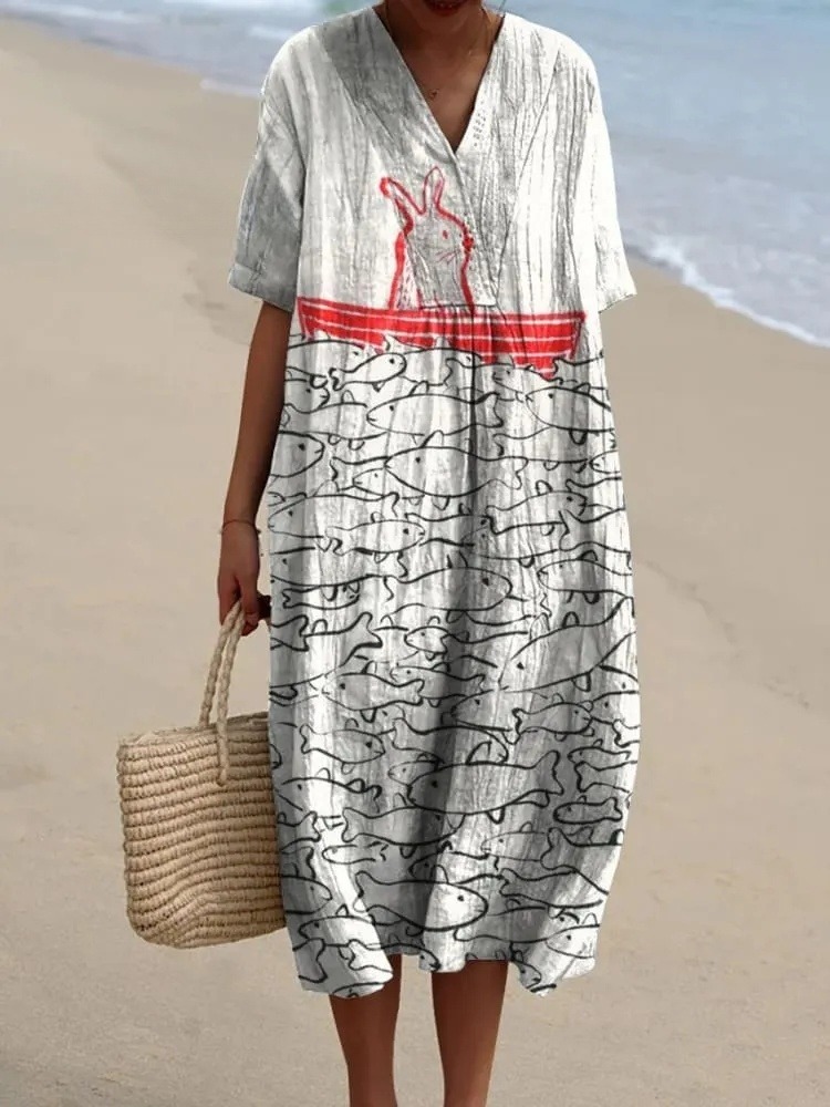Women's Rabbits and Schools of Fish On A Boat Watercolor Splash Fluid Art Print Flowy Dress