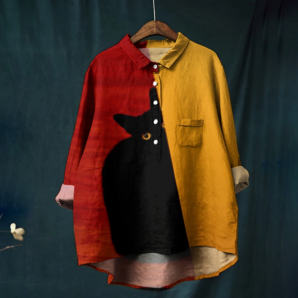 Women's Colorblock Cartoon Cat Printed Casual Shirt