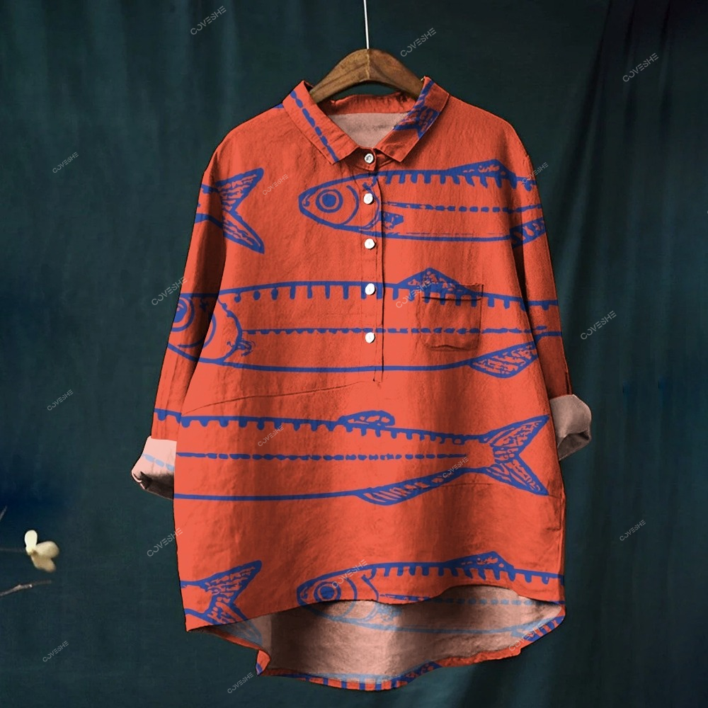 Women's Koi Vintage Flower Printed Casual Long Sleeve Shirt