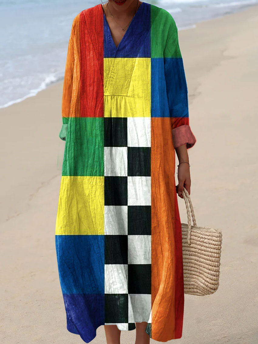 Women's Vintage Abstract Geometric Color Block Line Art Print Dress
