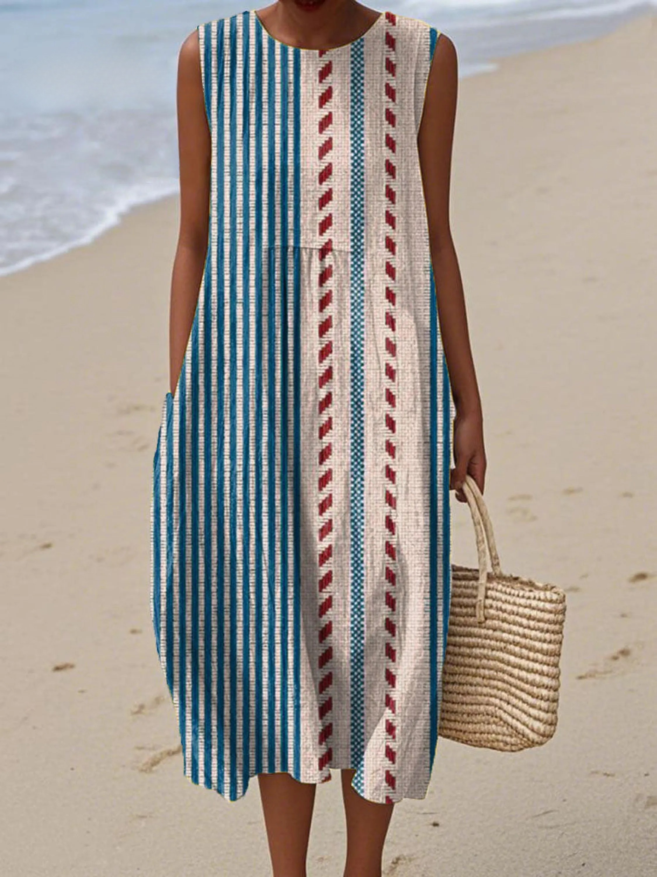 Women's Vintage Art Lines Print Sleeveless Cotton Pocket Wrap Dress