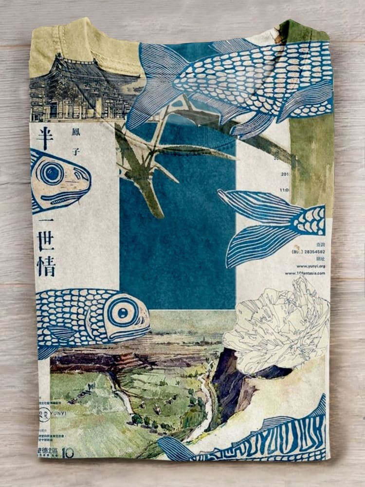 Women's Retro Abstract Colorblock Girls Fish Print Casual Shirt