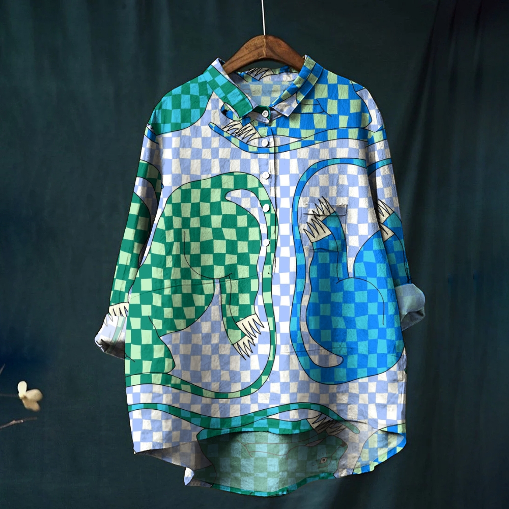 Women's Abstract Plaid Animals Printed Casual Shirt