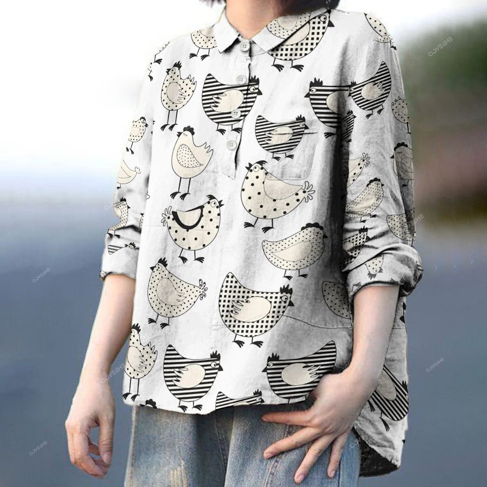 Women's Polka-dot Cartoon Chickens Printed Casual Long Sleeve Shirt