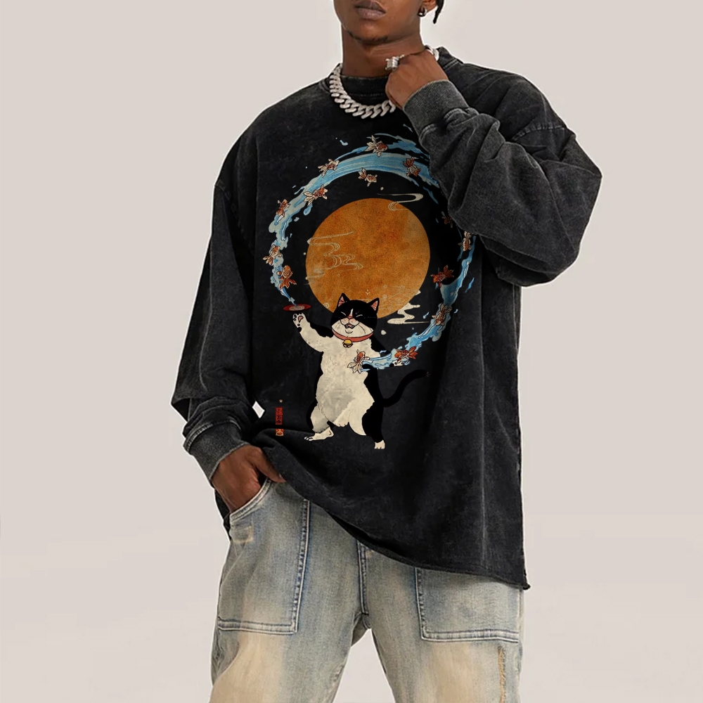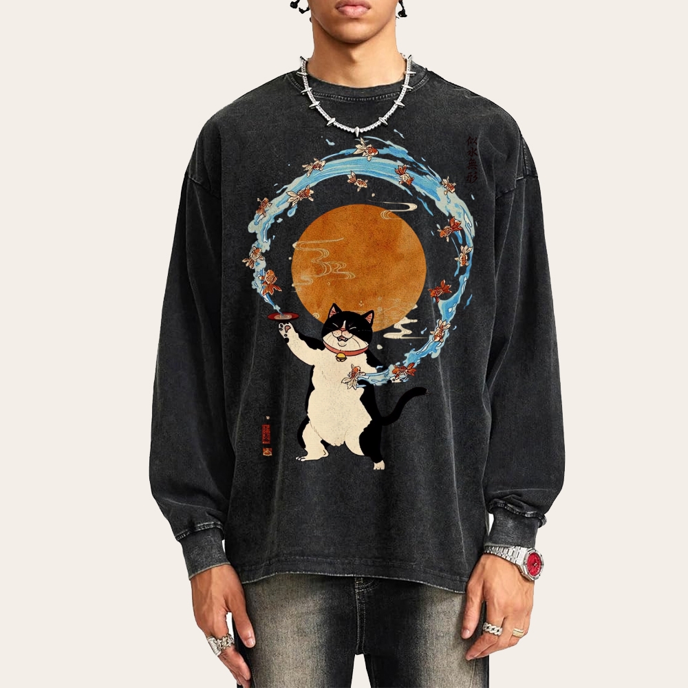 Goldfish Drunk Cat Deep Washed Vintage Long Sleeves T-Shirt