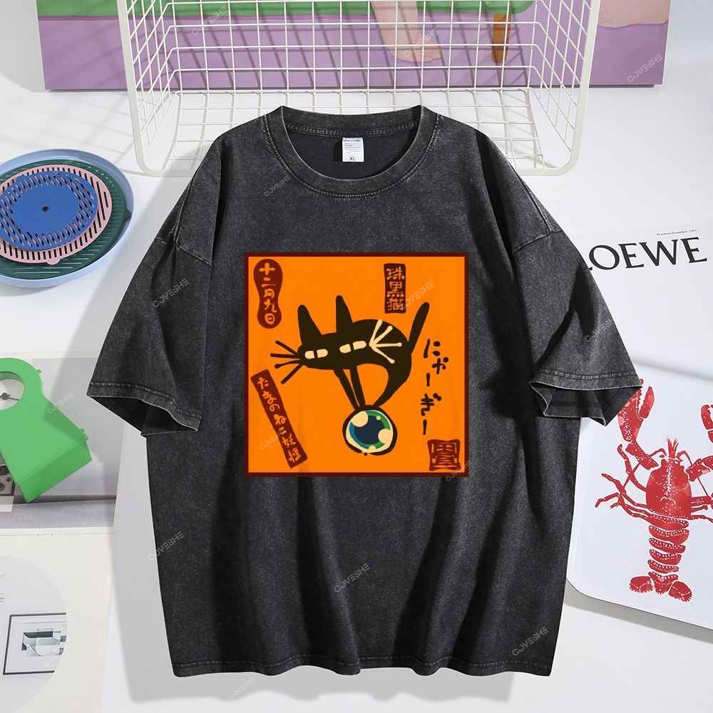 Unisex Vintage Japanese Cat Printed Washed Tee