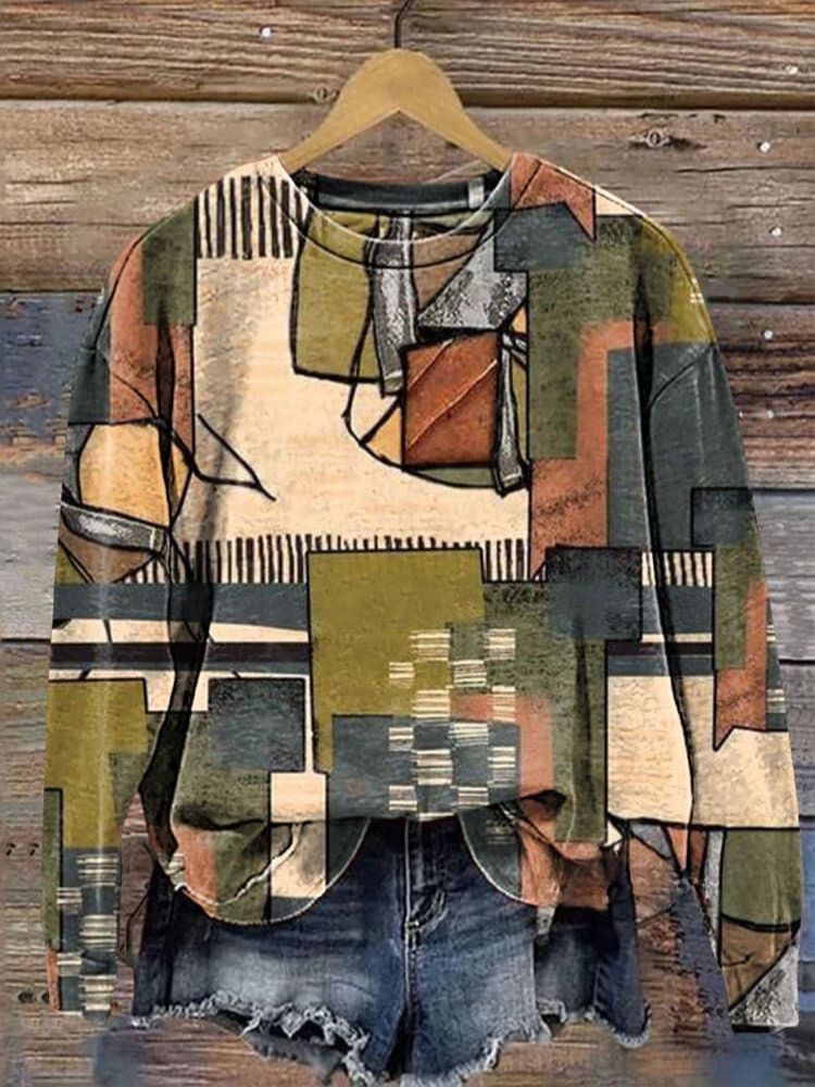 Vintage Abstract Color Block Splicing Painting Art Print Casual Sweatshirt