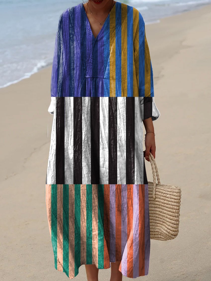 Women's Vintage Striped Color Block Art Print Flowy Dress