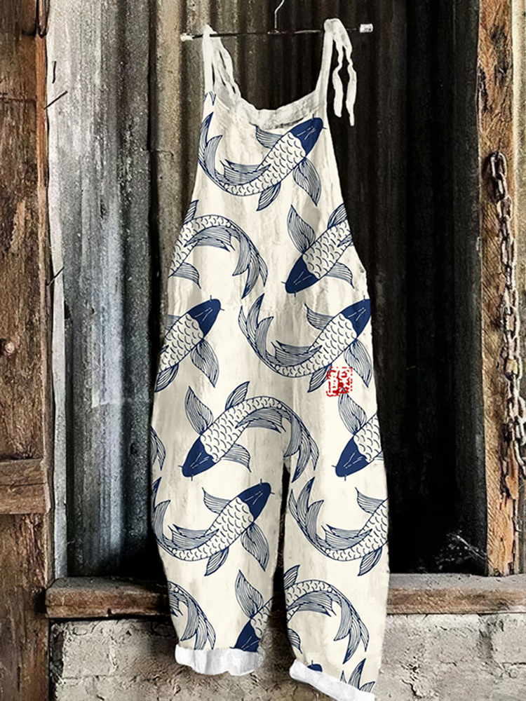 Vintage Japanese Art Koi Carp Printed Casual Jumpsuit