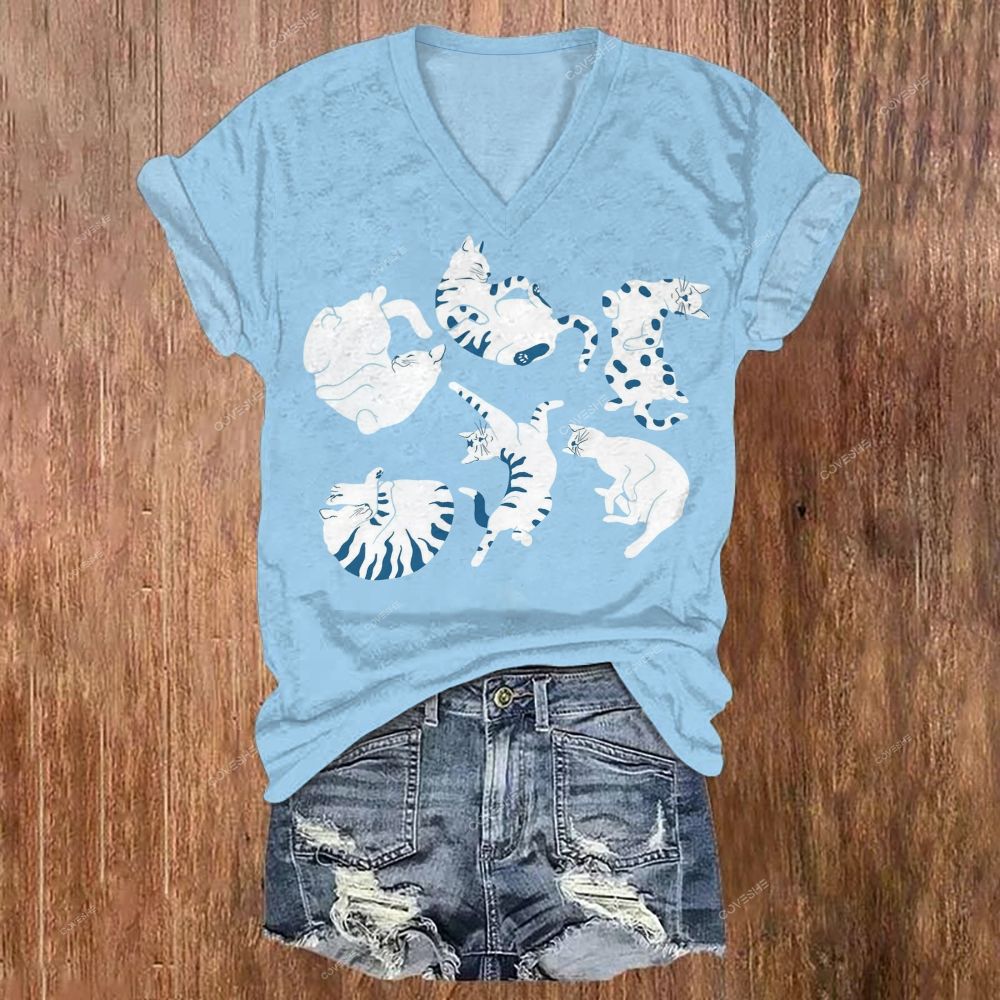 Women's V-neck Cat Printed Short Sleeve T-shirt