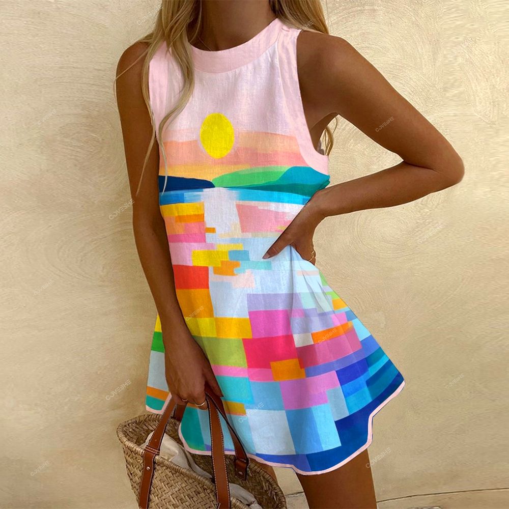 Women's Crew Neck Colorful Art Flowers Printed Short Sleeve Top