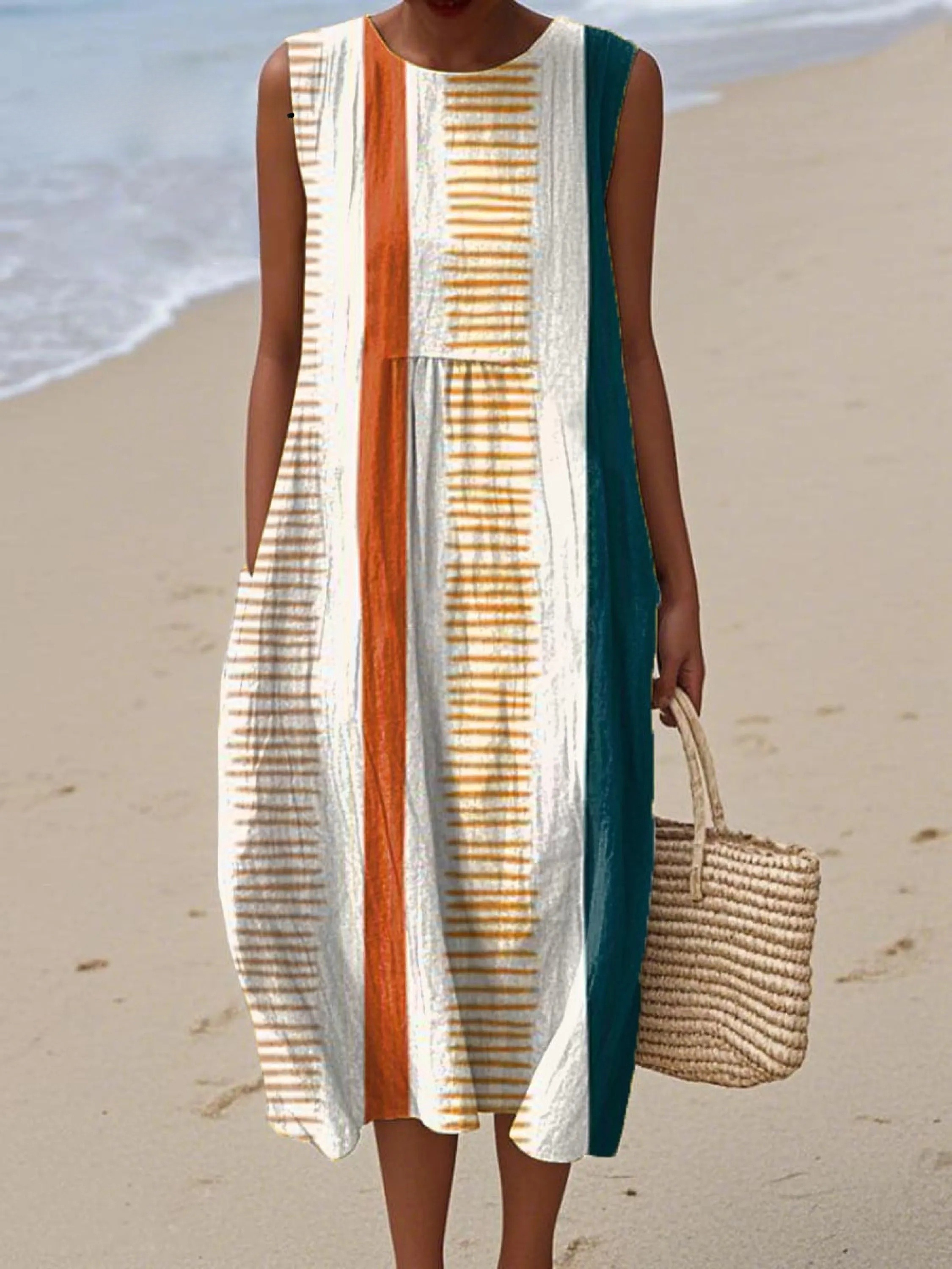 Women's Artistic Geometric Lines Print Sleeveless Cotton Pocket Wrap Dress