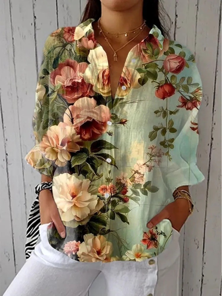 Women's Retro Floral Art Print Casual Shirt