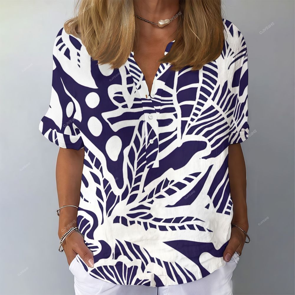 Women's Tropical Plant Printed Stand Collar Short Sleeve Shirt
