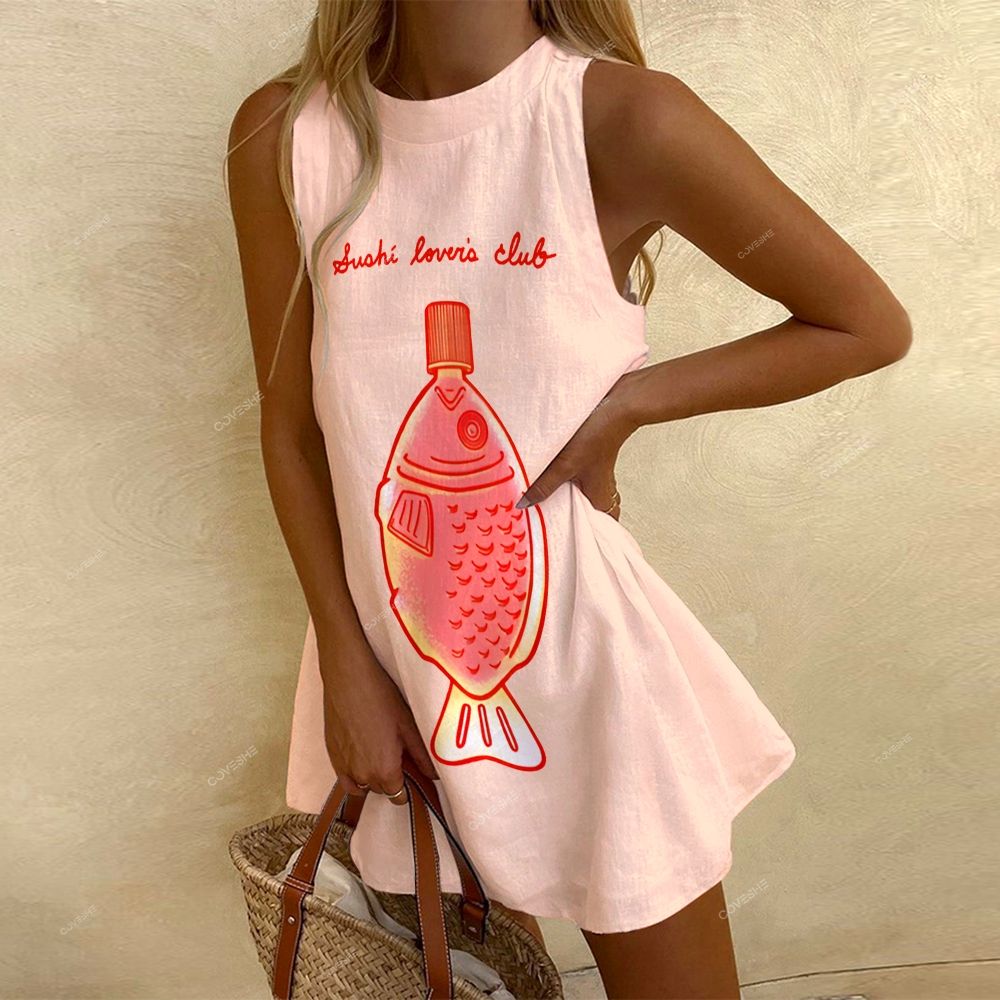 Women's Pink Sushi Fish Lover's Club Sleeveless Printed Dress