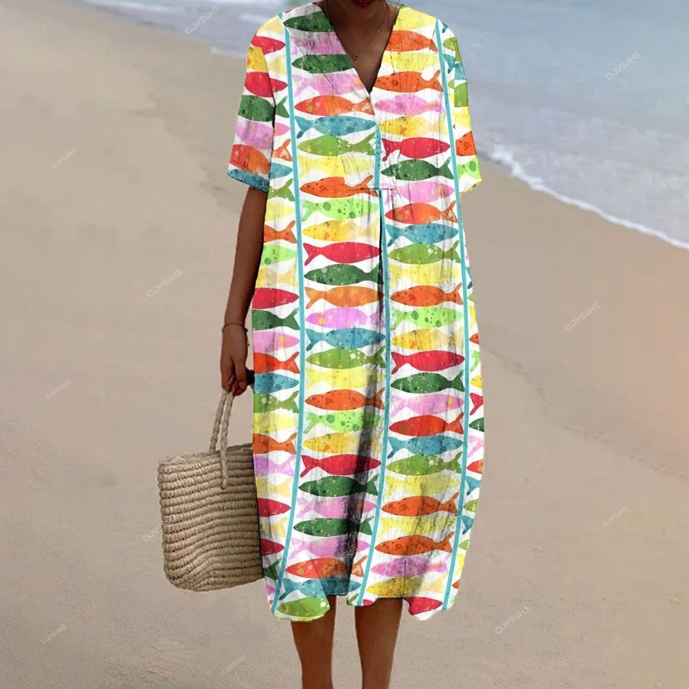 Women's Colorful Cartoon Fish Printed Flowy Dress