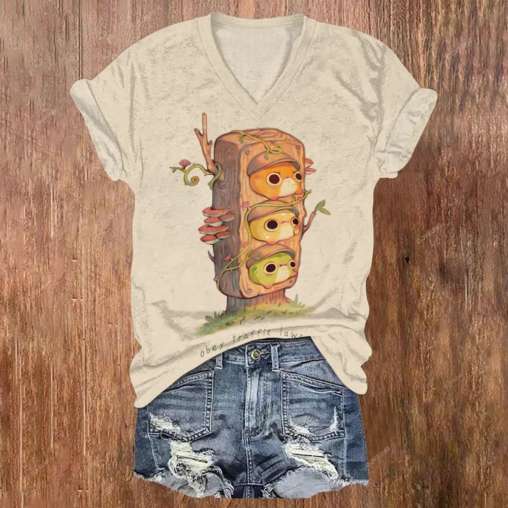 Women's V-neck Tree Stump Frog Printed Short Sleeve T-shirt