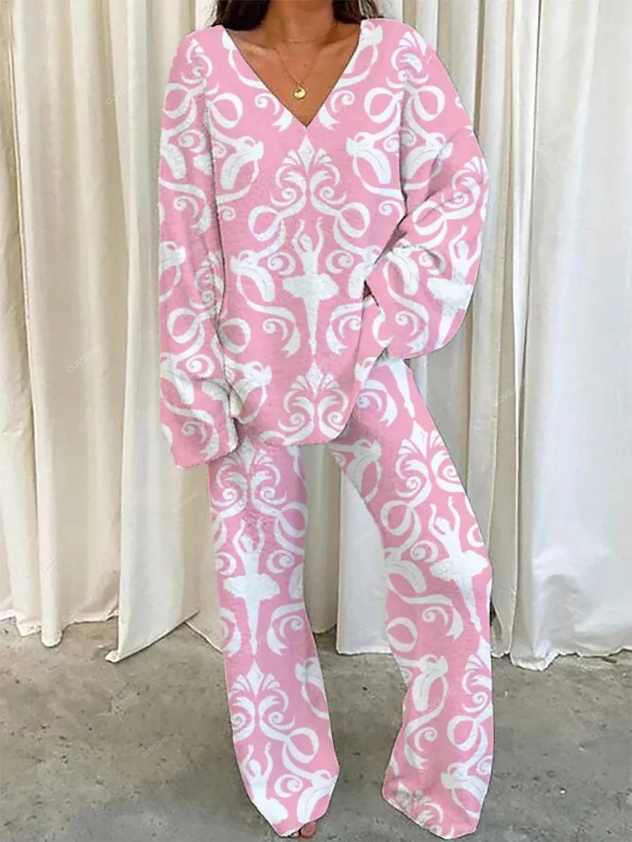 Women's Pink Bohemian Ballet Art Print Home Long Sleeve Suit