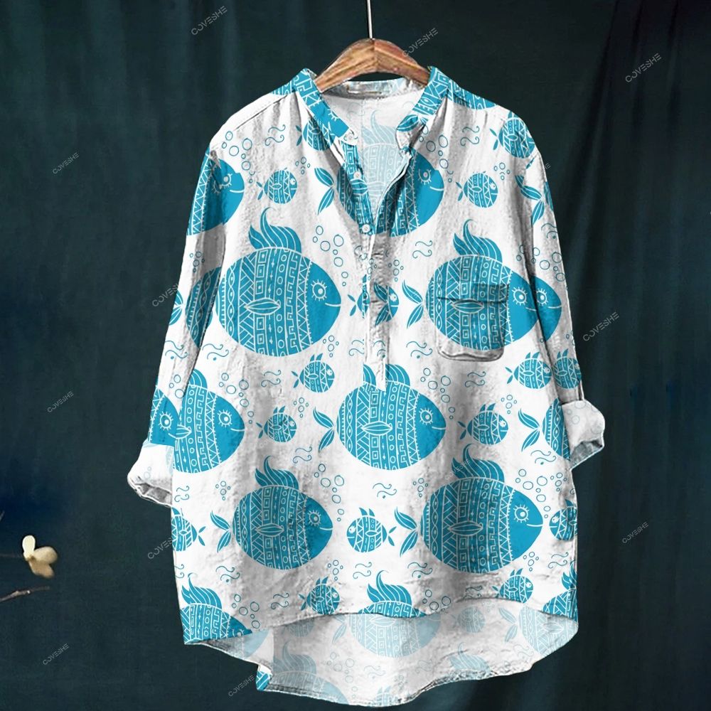 Women's Geometric Fish Printed Stand Collar Casual Shirt