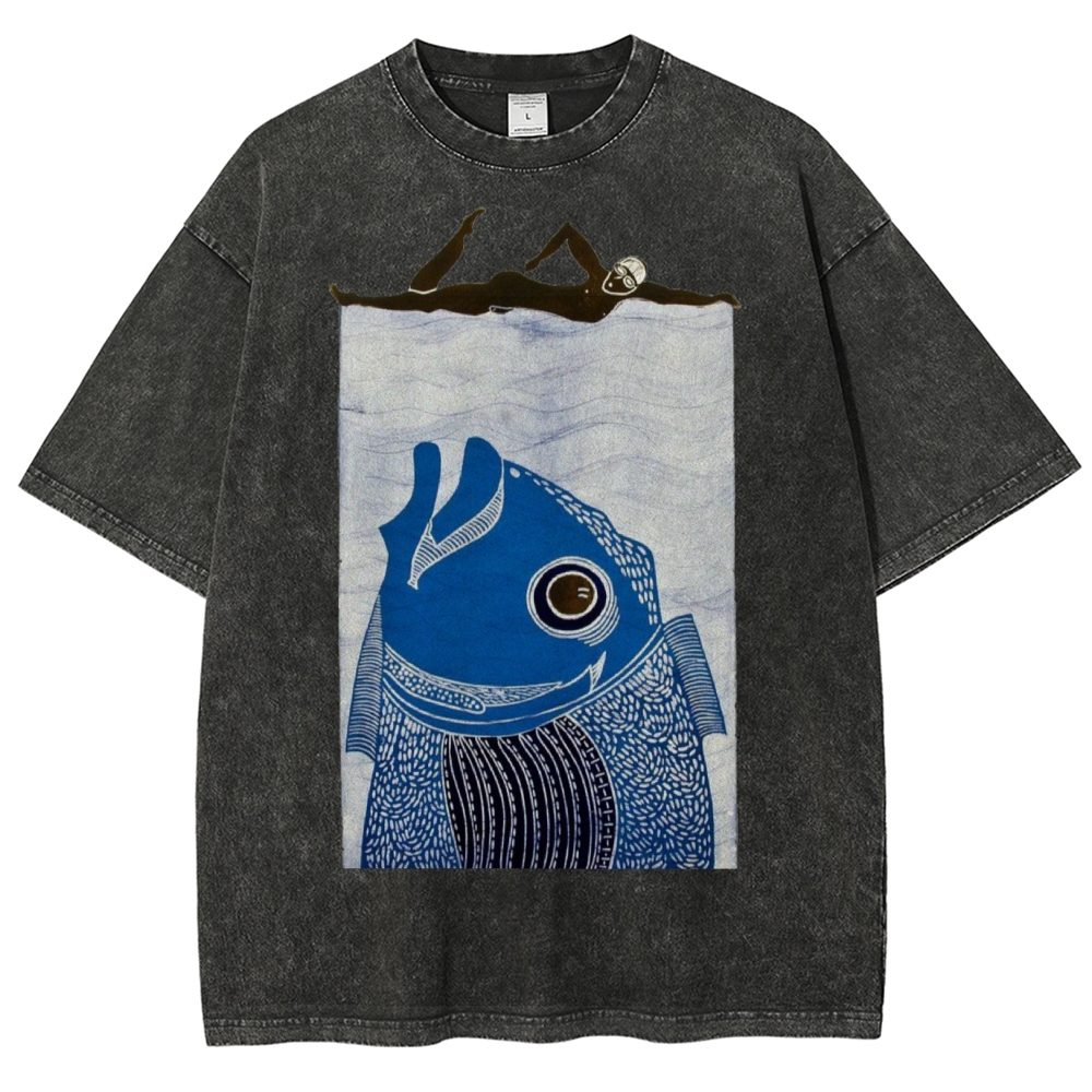 Unisex Fish Printed Washed Tee